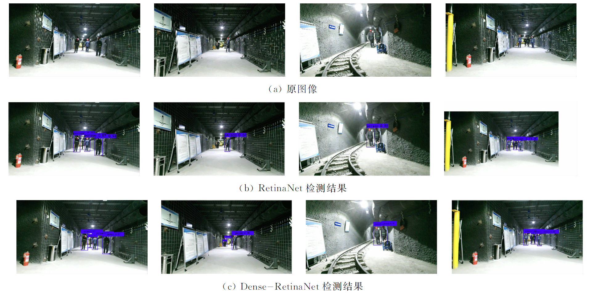 为验证Dense-RetinaNet的有效性,分别采用Dense-RetinaNet和RetinaNet对煤矿井下行人图像进行检测,结果如图7所示。可看出Dense-RetinaNet比RetinaNet有更好的小目标和多目标检测能力。