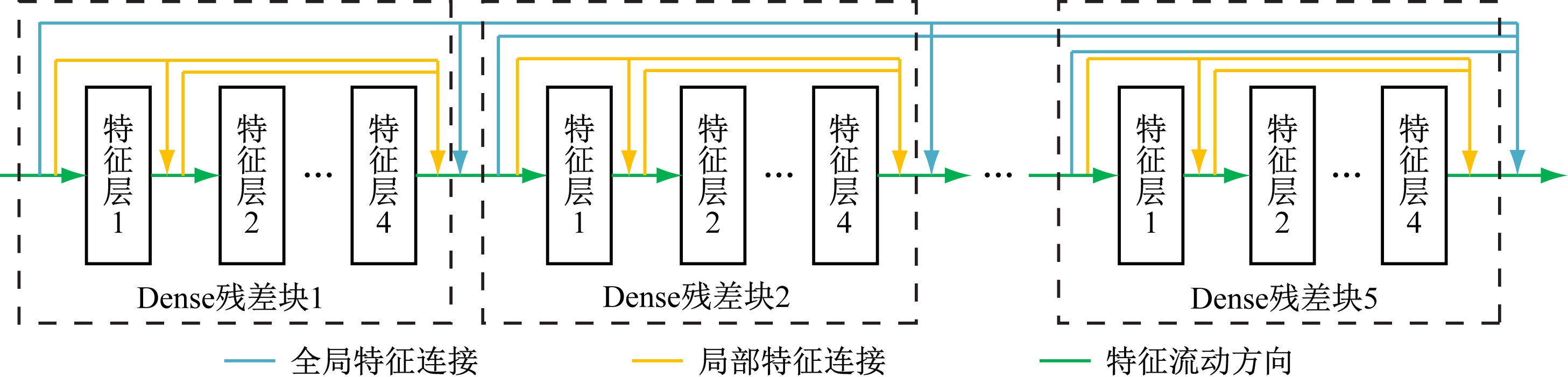 井下环境获得的图像所包含干扰更加复杂,为解决由光照等因素引起的井下图像中小目标不明显问题,本文对RetinaNet进行改进,在ResNet的基础上加入Dense连接[9],形成一种具有层级相连结构的Dense-RetinaNet,有助于在特征前向流动过程中使更多细节被保存,同时在反向传播过程中计算梯度时信息会被更加充分利用。改进的ResNet结构如图6所示。改进的ResNet中包含5个Dense残差块,每个Dense残差块中有4个特征层,特征层之间进行局部特征连接,各残差块之间进行全局特征连接。通过对局部特征和全局特征的连接,使得特征能够充分被传递,让网络可从图像中提取更丰富的特征,并且可抵抗梯度消失问题。