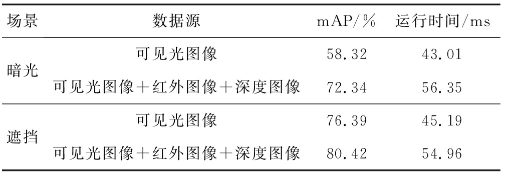场景数据源mAP/%运行时间/ms暗光可见光图像58.3243.01可见光图像+红外图像+深度图像72.3456.35遮挡可见光图像76.3945.19可见光图像+红外图像+深度图像80.4254.96
