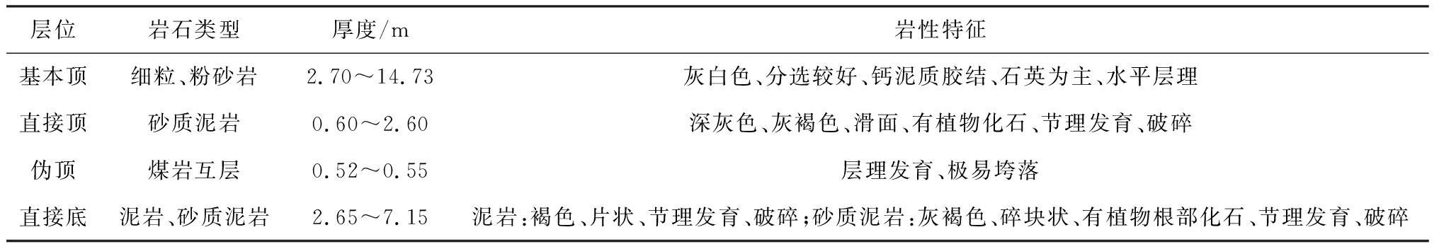 表1 煤层顶底板岩性