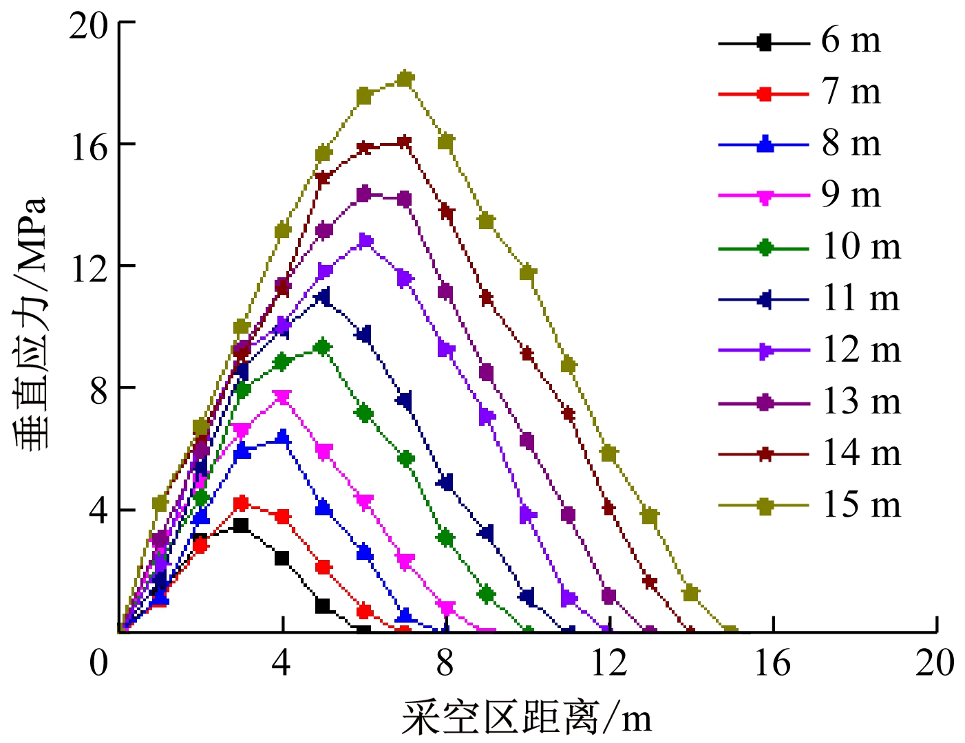 不同宽度条件下煤柱内垂直应力分布如图9、图10所示。由图9、图10可看出:① 煤柱宽度为6~15 m时,煤柱内垂直应力分布为先增大后减小的单峰形式,垂直应力峰值基本处于煤柱中间。随着煤柱宽度的增大,垂直应力峰值近似呈线性增大。② 煤柱宽度为6~12 m时,垂直应力峰值小于原岩应力,煤柱宽度为12 m时,与原岩应力大约持平,此时煤柱处于应力降低区。③ 煤柱宽度为12~15 m时,垂直应力高于原岩应力,此时煤柱处于应力增高区。所以,从煤柱内垂直应力分布规律考虑,留设合理煤柱宽度为6~12 m。