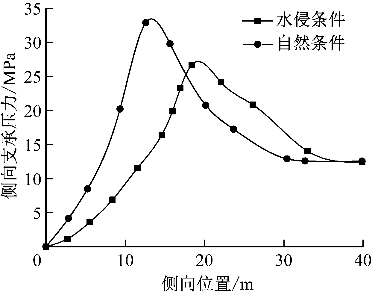 在回风巷采空区侧布置测线,I020901工作面开采后,自然条件和水侵条件下回风巷采空区侧向支承压力如图4所示。