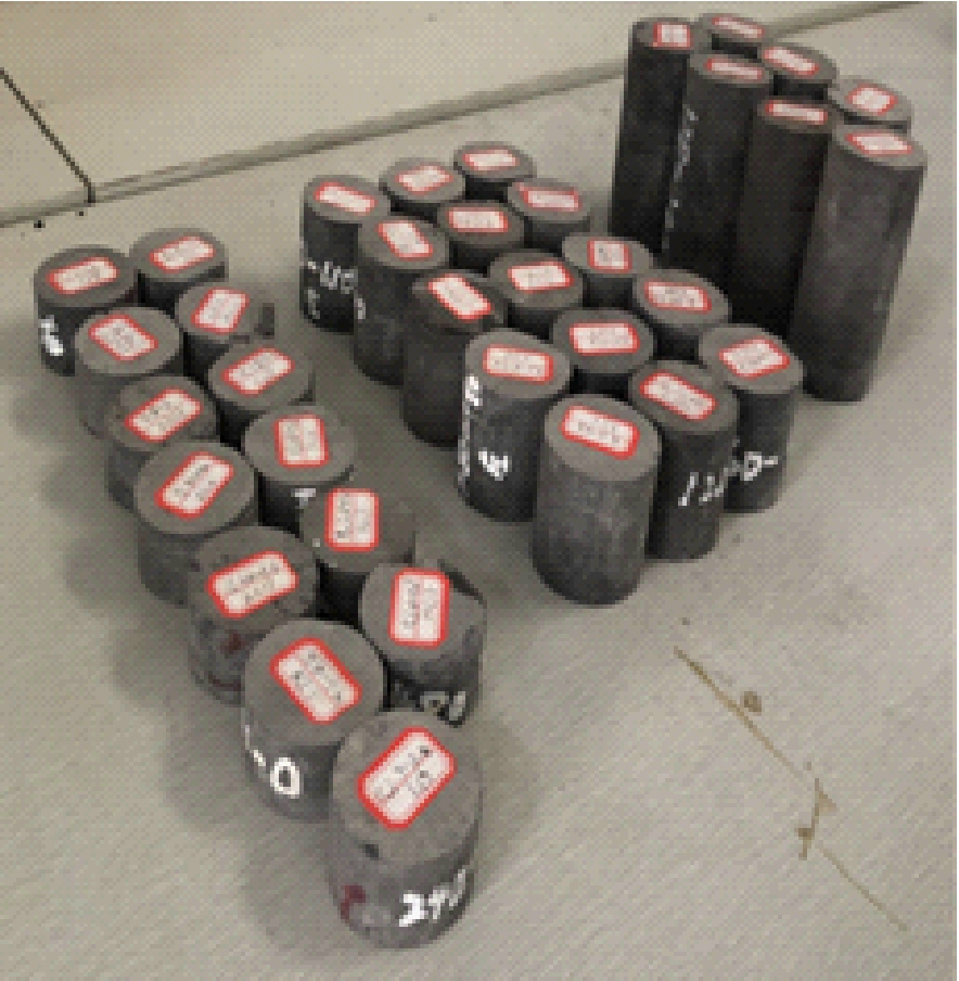 考虑到I020908回风巷围岩受I020901采空区积水浸泡影响的工程实际情况,将I020908工作面回风巷煤岩样进行标准加工,同时开展干燥煤岩样和自然吸水煤岩样的物理力学性质测试,测试采用的标准煤岩样如图2所示。
