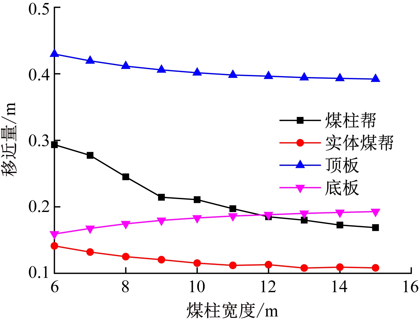 煤柱宽度与巷道围岩变形关系如图11所示。由图11可看出:随着煤柱宽度的增大,顶板及实体煤帮位移先减小后趋于稳定,煤柱帮位移随煤柱宽度增大而减小。当煤柱宽度为6~12 m时,顶板、实体煤帮及煤柱帮移近量逐渐减小,底板底鼓量逐渐增加,但顶板、实体煤帮和底板减小(增加)幅度较小;煤柱帮从0.293 m减小到0.211 m,减小了27.9%,说明煤柱宽度对煤柱帮影响较大。当煤柱宽度为12~15 m时,巷道围岩基本趋于稳定。从巷道表面位移考虑,合理煤柱宽度为6~12 m。