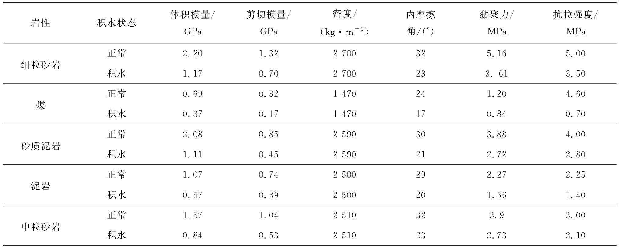 岩性积水状态体积模量/GPa剪切模量/GPa密度/(kg·m-3)内摩擦角/(°)黏聚力/MPa抗拉强度/MPa正常2.201.322 700325.165.00细粒砂岩积水1.170.702 700233. 613.50正常0.690.321 470241.204.60煤积水0.370.171 470170.840.70正常2.080.852 590303.884.00砂质泥岩积水1.110.452 590212.722.80正常1.070.742 500292.272.25泥岩积水0.570.392 500201.561.40正常1.571.042 510323.93.00中粒砂岩积水0.840.532 510232.732.10