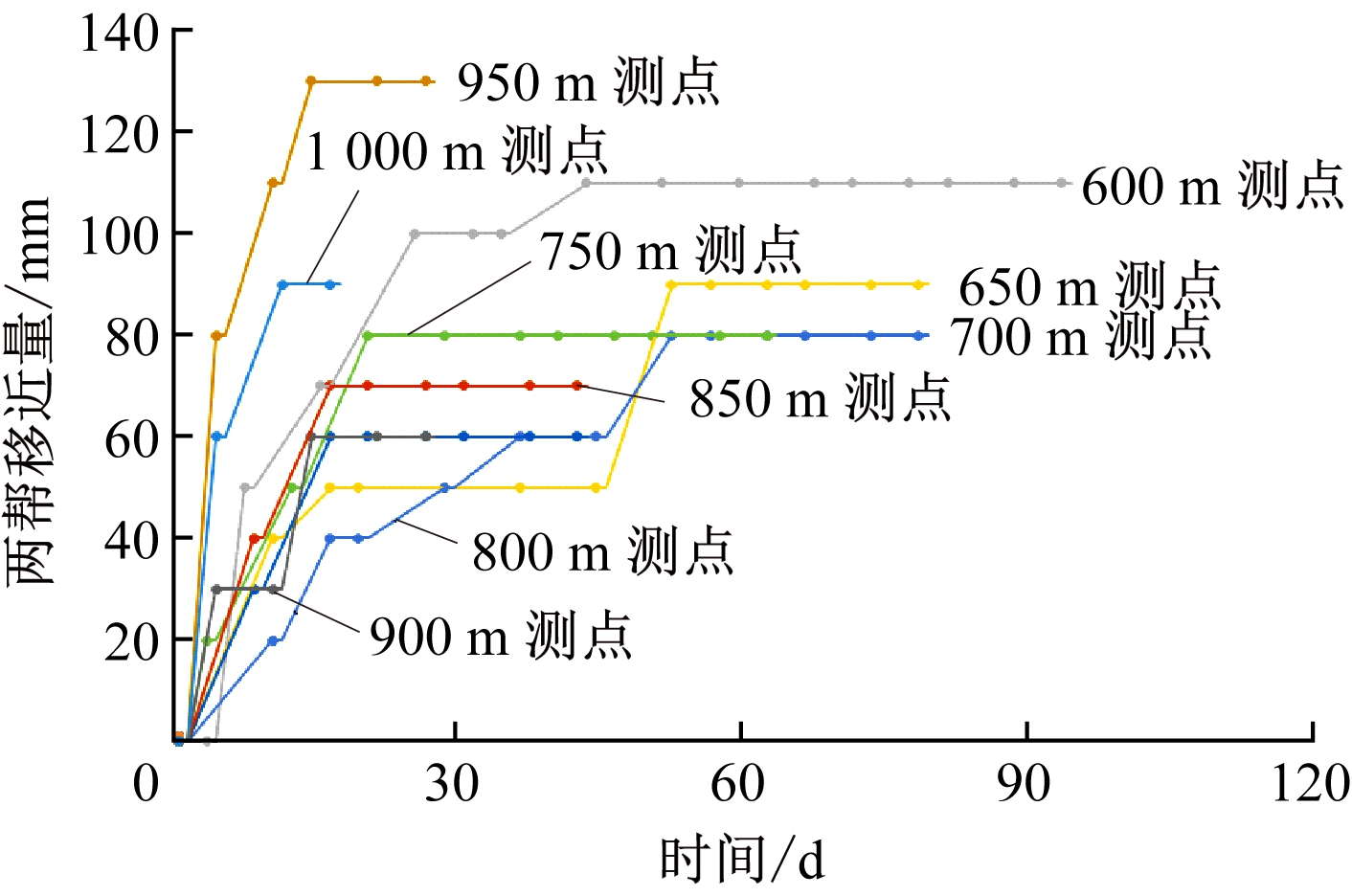 Fig.14 Convergence curves of surface displacement of roadway surrounding rock