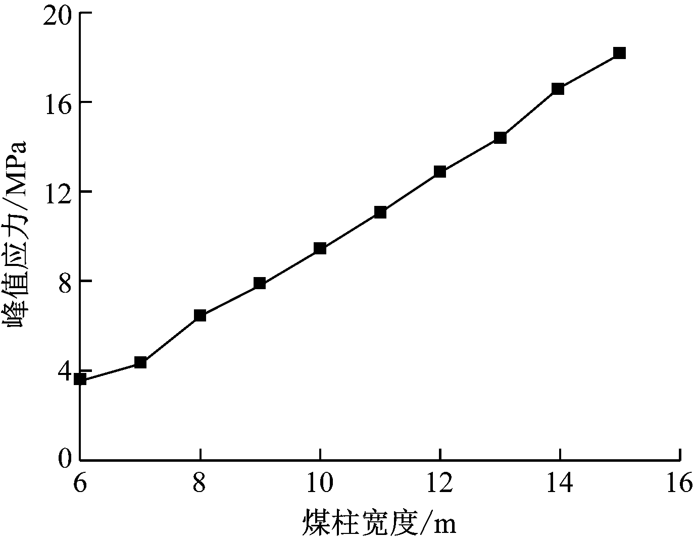 图10 煤柱应力峰值与煤柱宽度关系曲线