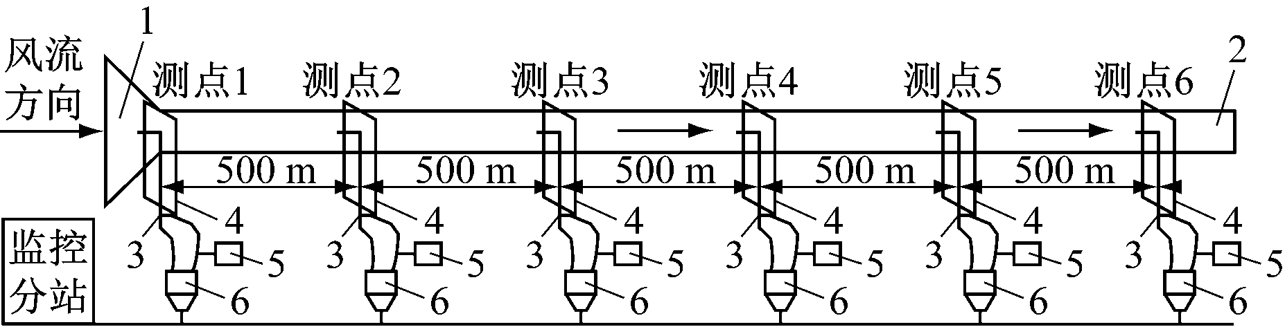 1-局部通风机出口;2-风筒出口;3-皮托管;4-测量断面;5-通风参数显示模块;6-通风多参数测量仪。