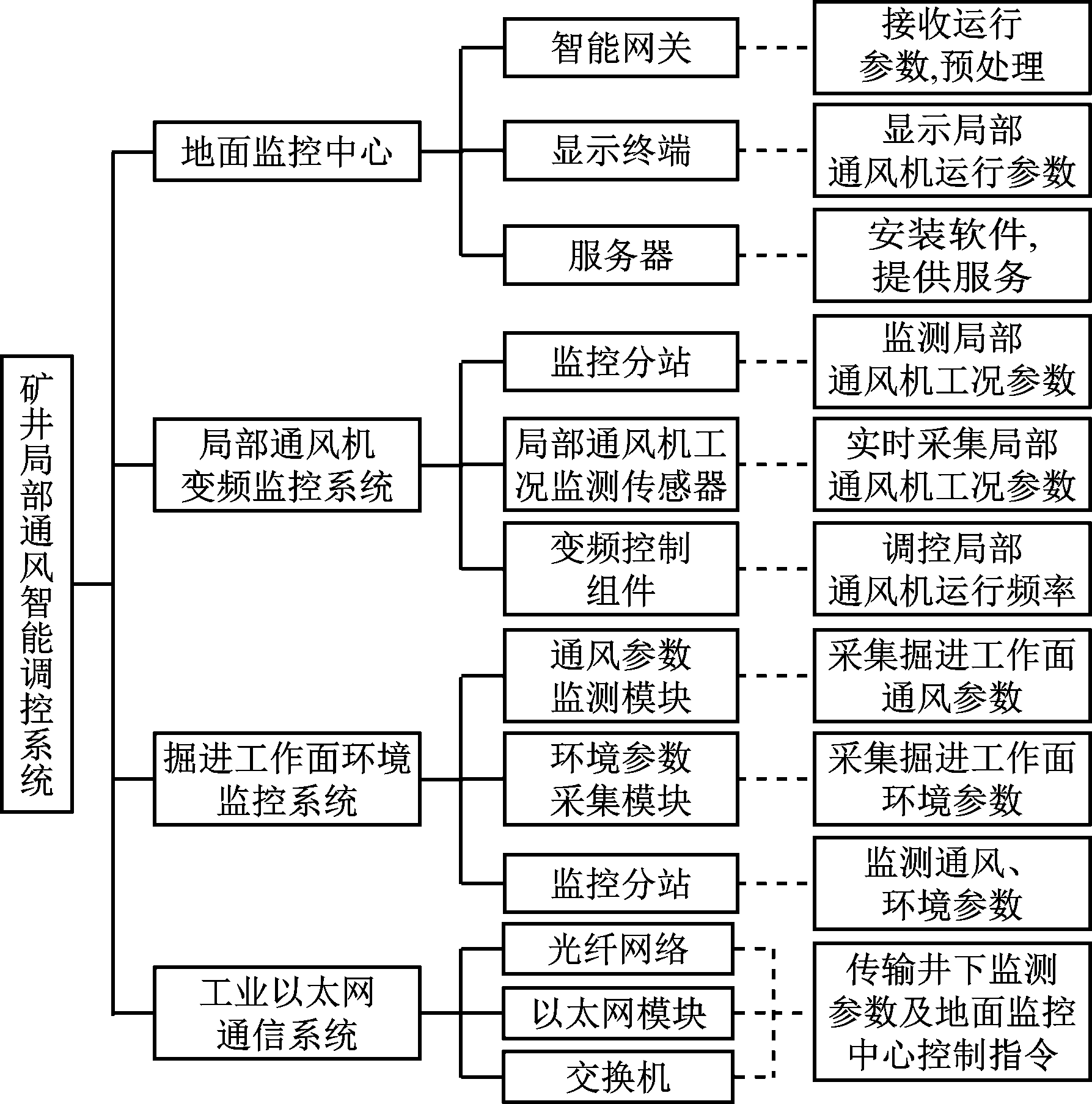 矿井局部通风智能调控系统包括局部通风参数实时监测、局部通风系统功耗分析、风量供需匹配分析、通风异常研判预警等功能模块。局部通风参数实时监测模块包括各种传感器和监控分站,通过风筒风量测点优化布置和监测动压动能计算校验,实现局部风量准确监测。局部通风系统功耗分析模块实现风筒阻力可视化监测和异常预警。风量供需匹配分析模块依据风量数据及风量供需的超前模拟,对通风机调控进行预测,并生成智能化调控方案。通风异常研判预警模块依据监测的多元环境参数,提取局部通风故障状态的特征样本和前兆信息,实现局部通风状态的发展态势研判预警。