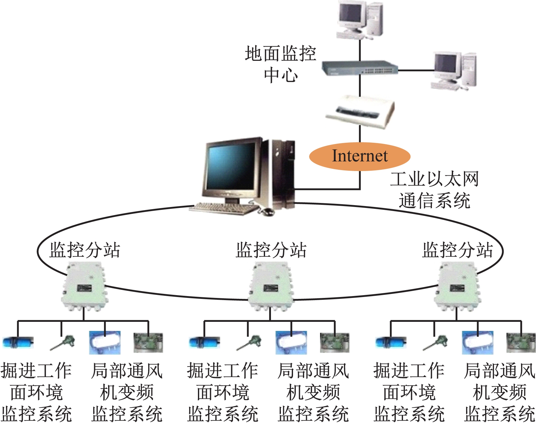 矿井局部通风智能调控系统由地面监控中心、局部通风机变频监控系统、掘进工作面环境监控系统、工业以太网通信系统组成,如图1所示。