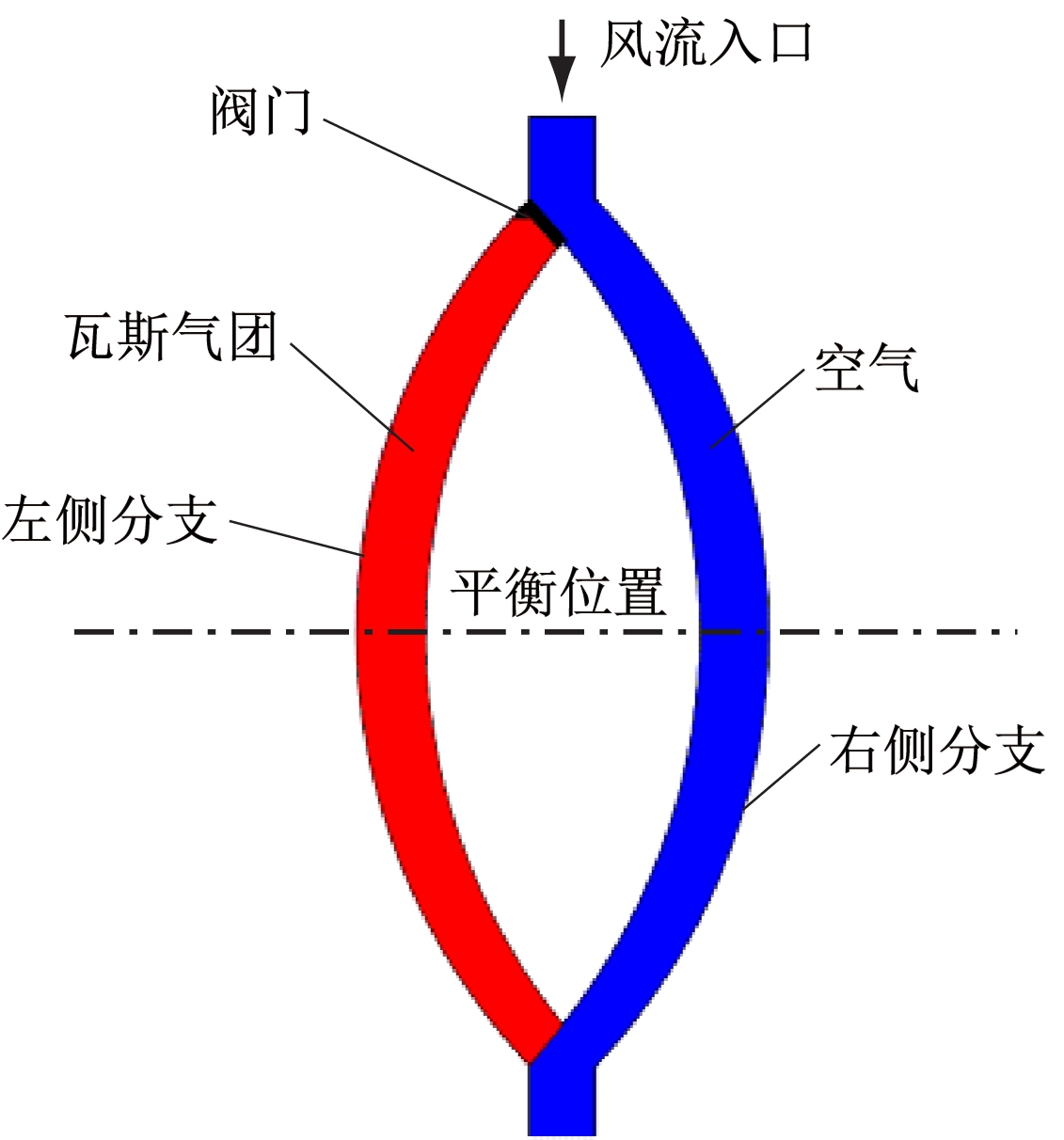 瓦斯气团进入旁侧分支后,进入旁侧分支的部分与停留在瓦斯分支的部分受到的通风机作用力方向相反。因此,瓦斯气团中心距离平衡位置最远时,通风机对瓦斯气团的作用力最大,而当瓦斯气团中心到达平衡位置时,瓦斯气团不受通风机的作用力。
