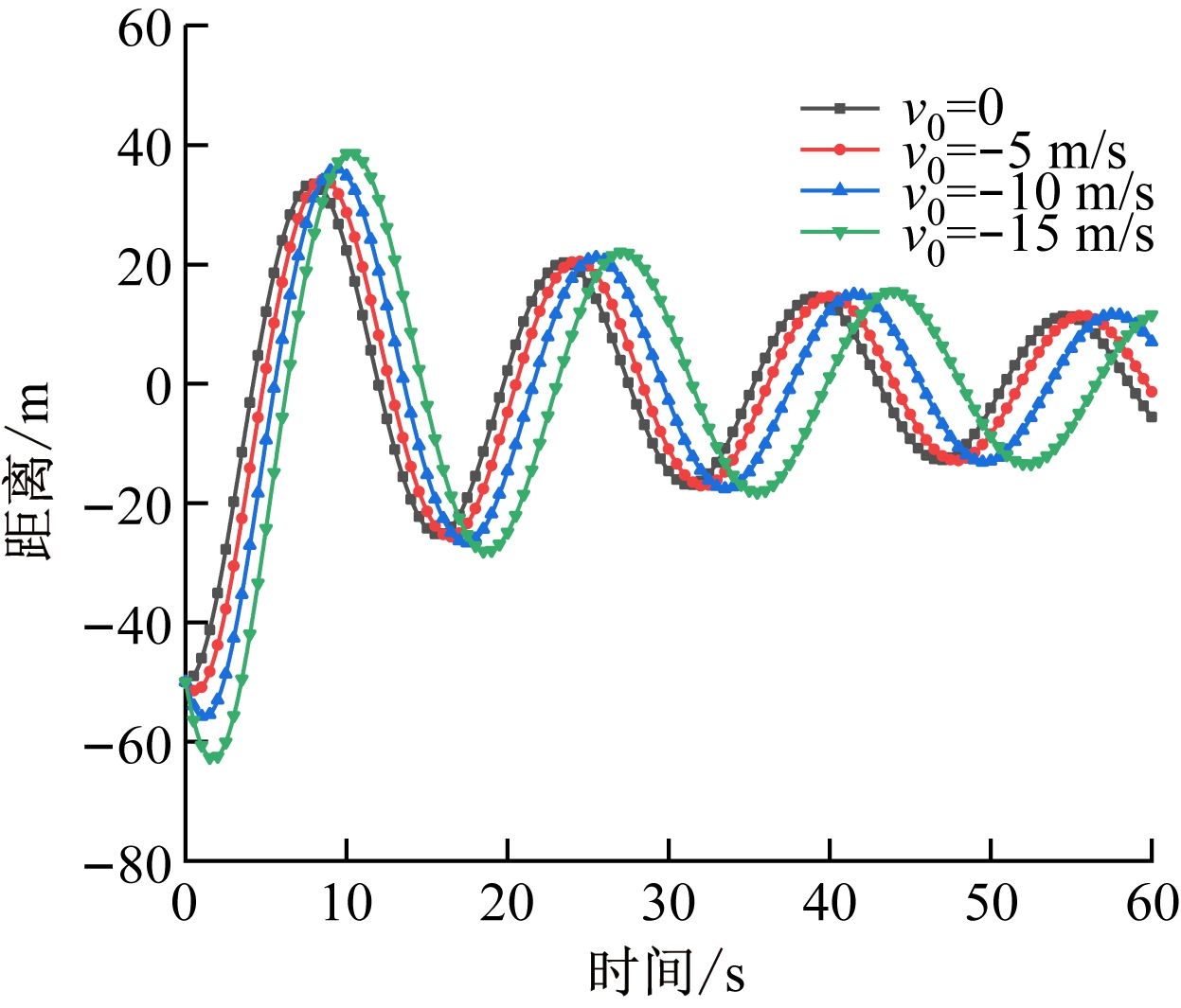 因为在较短的时间内甲烷与空气的混合程度较小,所以在下行通风的数值模拟中,假设甲烷和空气保持分离,不混合,并且没有瓦斯从管道中流出。根据式(9)得到不同初始风速v0下瓦斯气团中心偏离平衡位置的距离随时间变化曲线,如图2所示。
