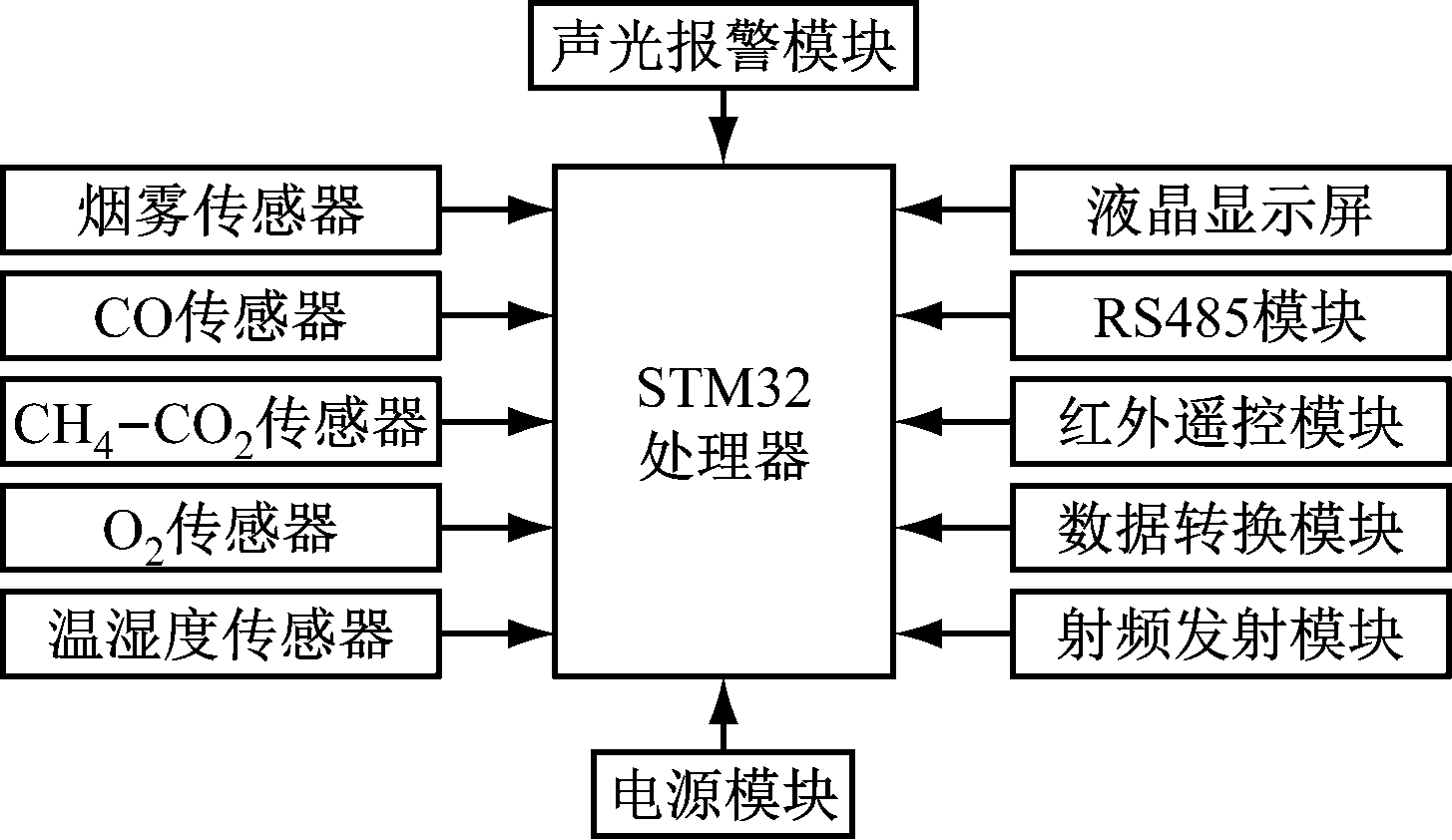 多参数传感器主要由矿用本安型外壳、温湿度传感器、CO传感器、CO2-CH4传感器、O2传感器、烟雾传感器、声光报警模块、射频发射模块、电源模块、红外遥控模块等组成,如图3所示。各传感器测量范围及精度见表1。