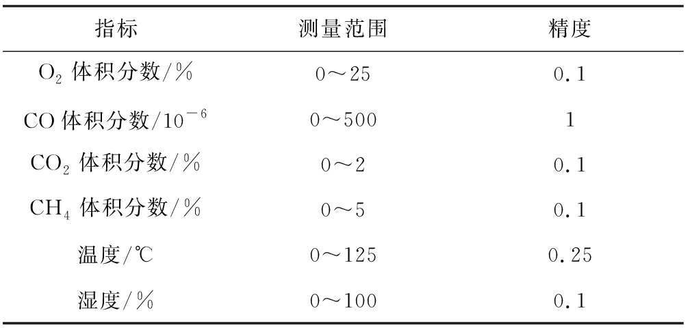 指标测量范围精度O2体积分数/%0~250.1CO体积分数/10-60~5001CO2体积分数/%0~20.1CH4体积分数/%0~50.1温度/℃0~1250.25湿度/%0~1000.1