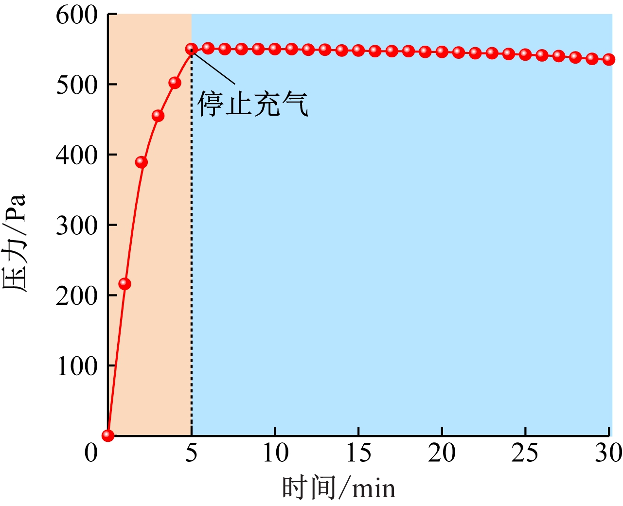 在地面控制平台向密闭隔离装置发送控制信号,测试PLC控制器能否正常启动电磁阀。同时,通过压力传感器记录囊袋充气过程中压力传感器数值变化,并实时观察囊袋状况,当达到预设压力值550 Pa后,停止充气。采用倾斜式压差计测量密闭前后压差。囊袋内部压力变化如图6所示,密闭前后压差及漏风率如图7所示。