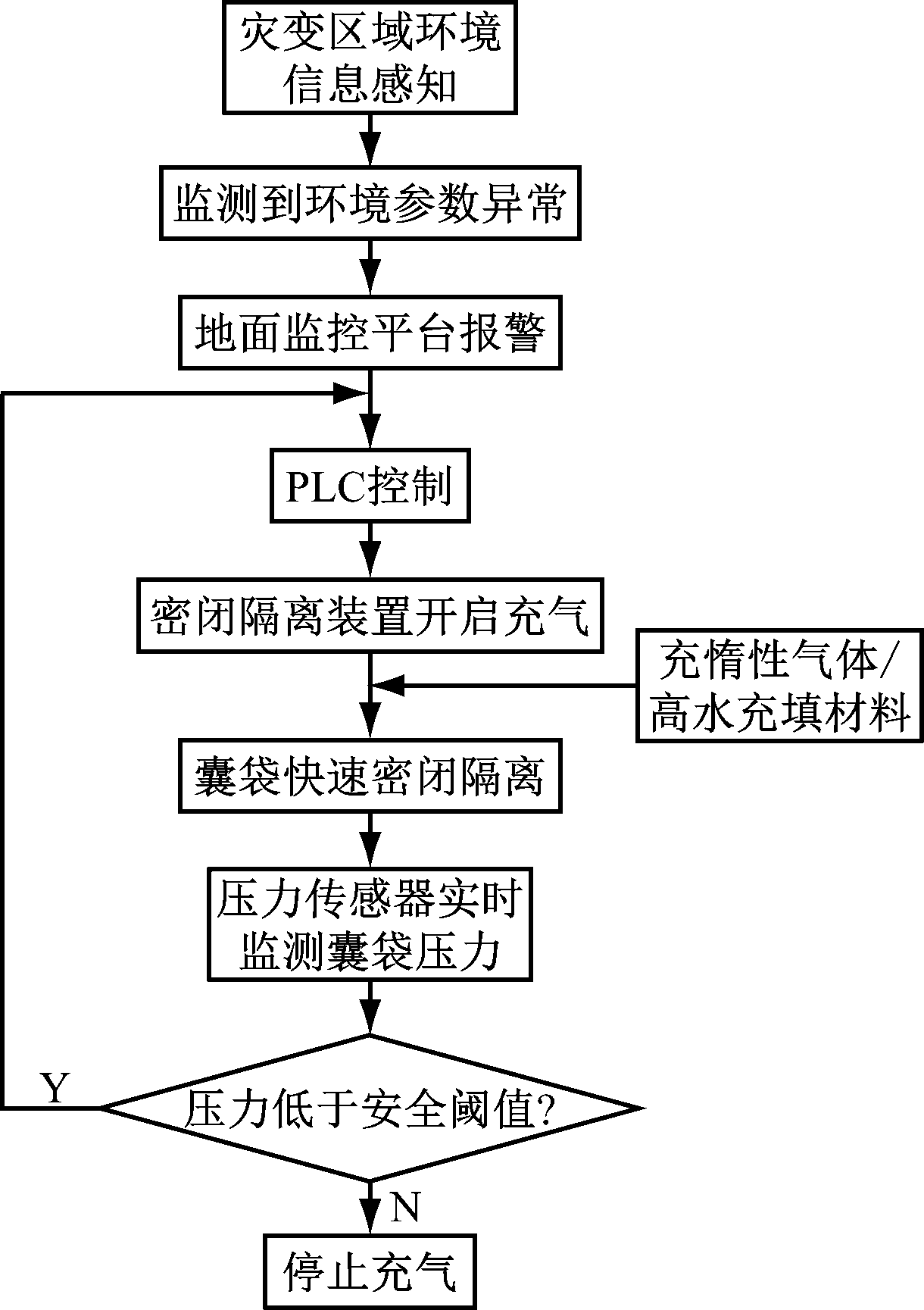 在预先判定的危险区域布置监测节点,通过多参数传感器和红外摄像仪对多个测点的环境信息进行同步采集并传输至地面监控平台。监控平台根据环境监测数据及视频信息对井下危险区域状况进行研判。当传感器监测到CO体积分数呈现上升趋势时,系统报警。当CO体积分数达到24×10-6时,工作区域人员撤离,测试系统压力条件,通过远程控制方式控制密闭隔离装置开启,控制信号通过局域网传输至井下PLC控制器,通过控制电磁阀实现对囊袋充填。囊袋通过预设滑轨传动系统从存储仓扩展至整个断面,实现应急密闭隔离。