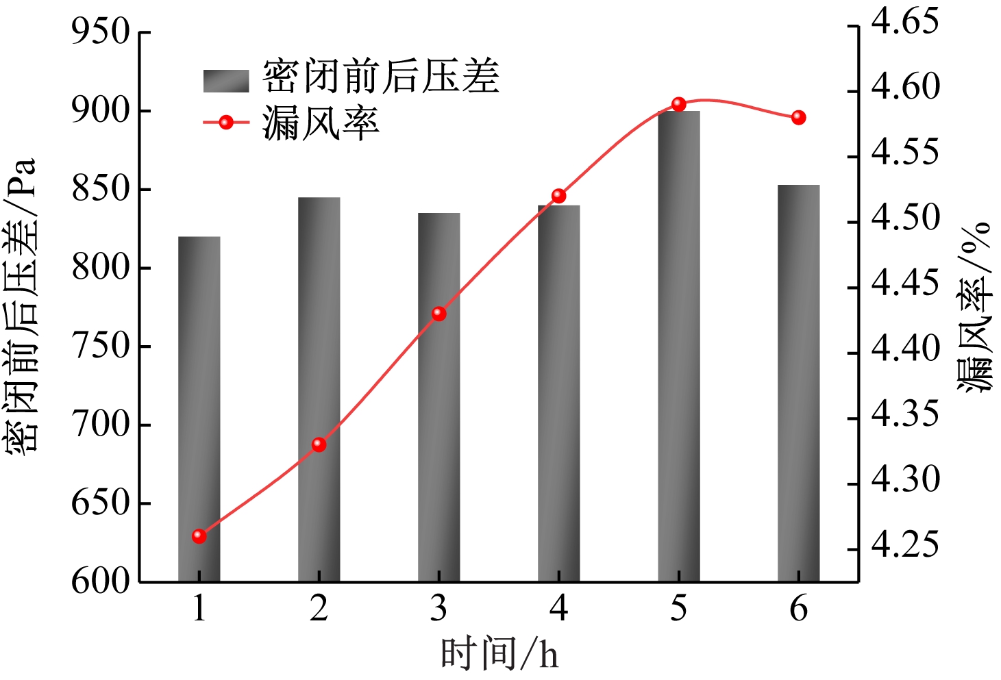 由图6和图7可知,密闭囊袋在5 min内完成开启,停止充气后,囊袋内部压力基本保持稳定,可满足现场使用要求。密闭囊袋两侧压差保持相对稳定,漏风率在5%以内。