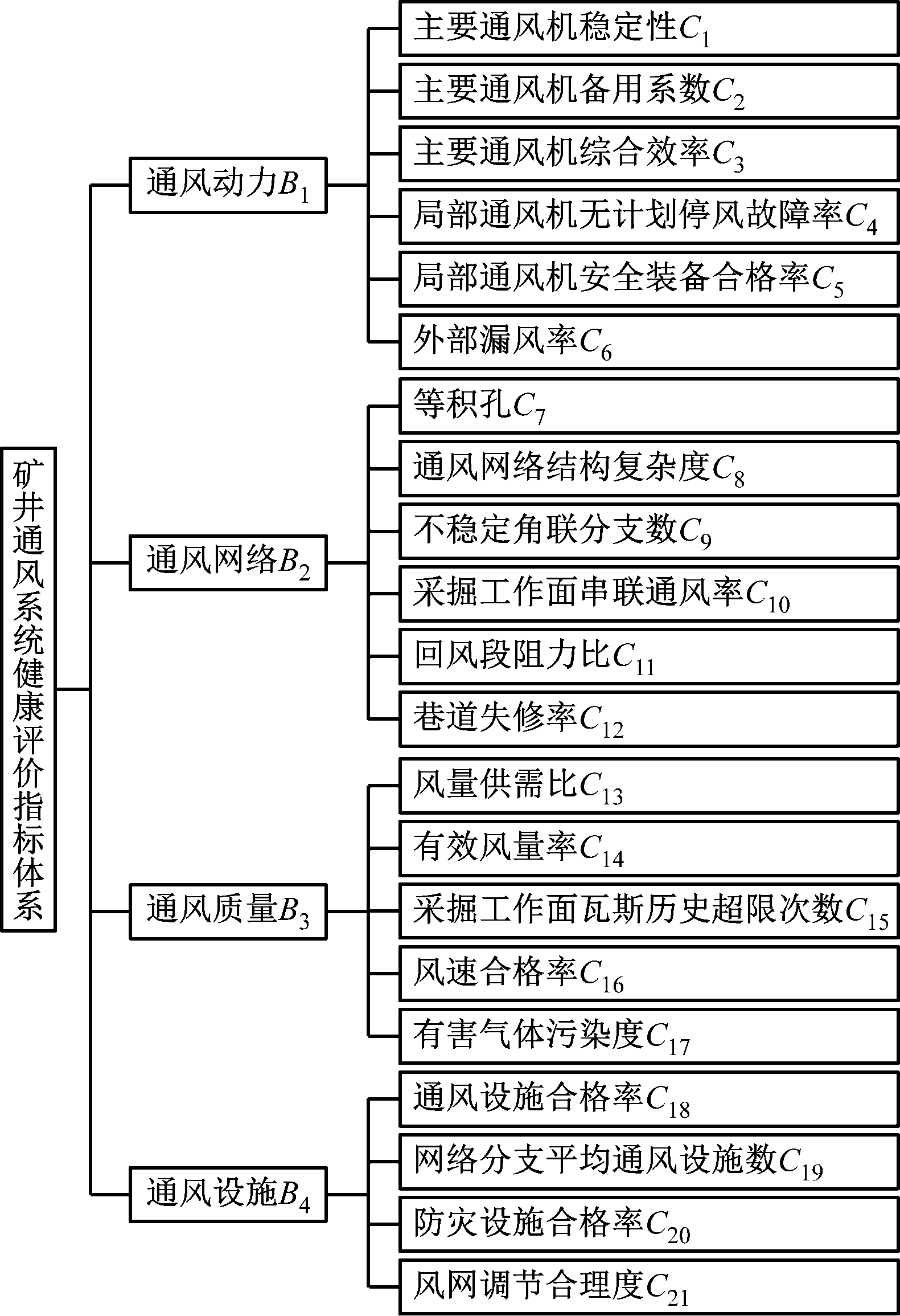 通过理论分析、现场调研、查阅文献等方式,确定了通风动力、通风网络、通风质量、通风设施4项因素(B1—B4)作为评价矿井通风系统健康度的一级指标,主要通风机稳定性、等积孔、风速合格率、通风设施合格率等21项因素(C1—C21)作为二级指标[12],建立矿井通风系统健康评价指标体系,如图1所示。