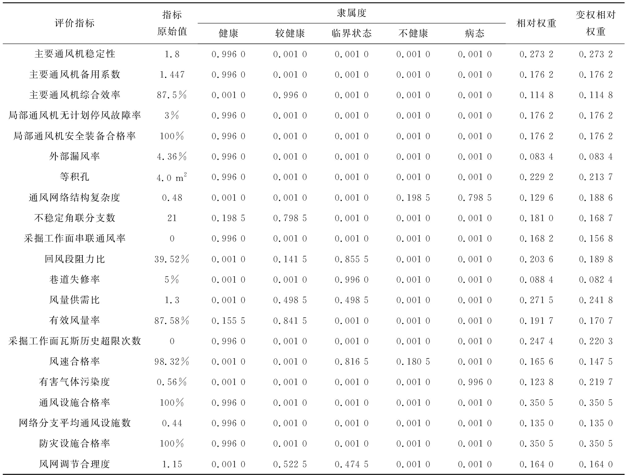 矿井通风系统健康评价指标相对权重及隶属度计算结果见表4。