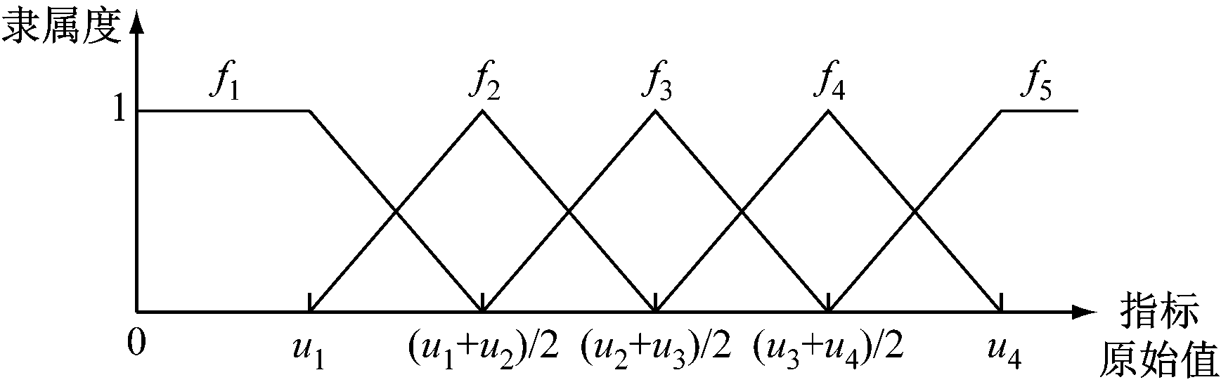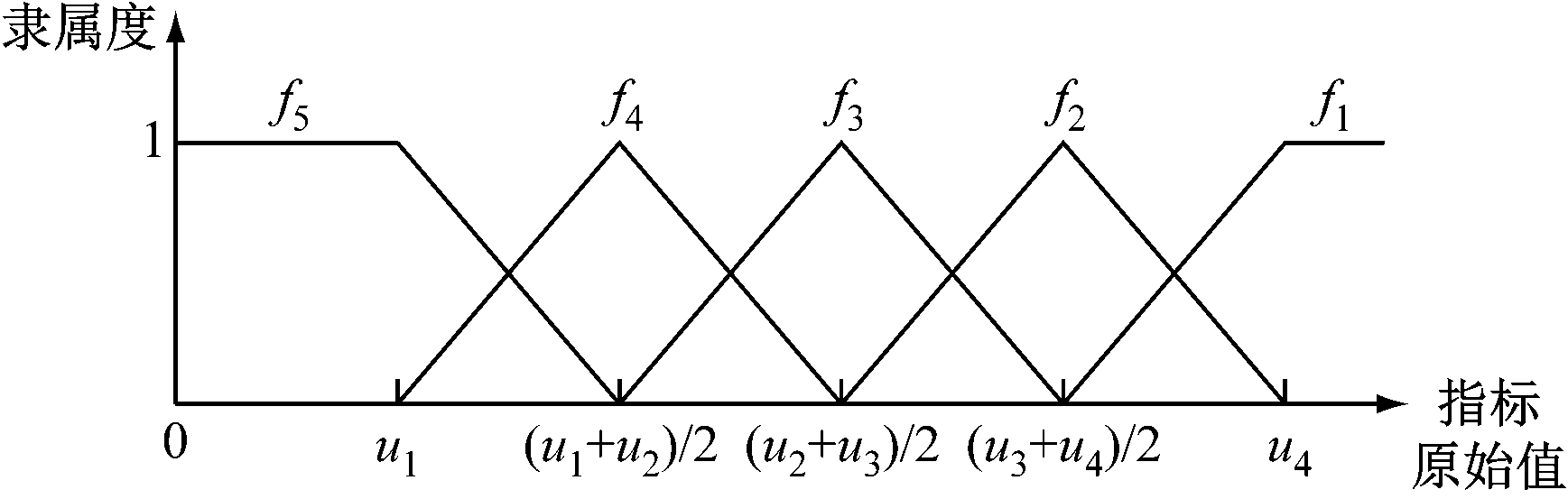 采用隶属度函数对各评价指标原始值进行处理,将不同维度的数值转换为[0,1]区间的隶属度。根据矿井通风系统健康评价指标特点,将其划分为效益型(数值越大越好)和成本型(数值越小越好)2种[19],其中主要通风机稳定性、主要通风机备用系数、主要通风机综合效率、局部通风机安全装备合格率、等积孔、有效风量率、风速合格率、通风设施合格率、防灾设施合格率为效益型指标,其余为成本型指标。指标分级界限由u1—u4表示[12]。本文拟定的隶属度函数为线性函数,如图2所示,函数表达式见表3,其中μ为隶属度,x为评价指标原始值。