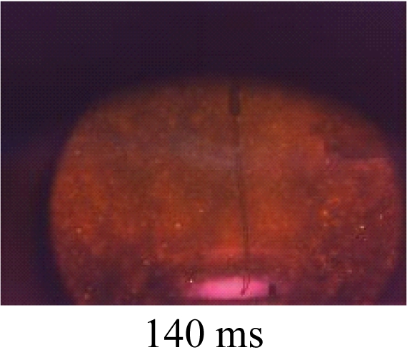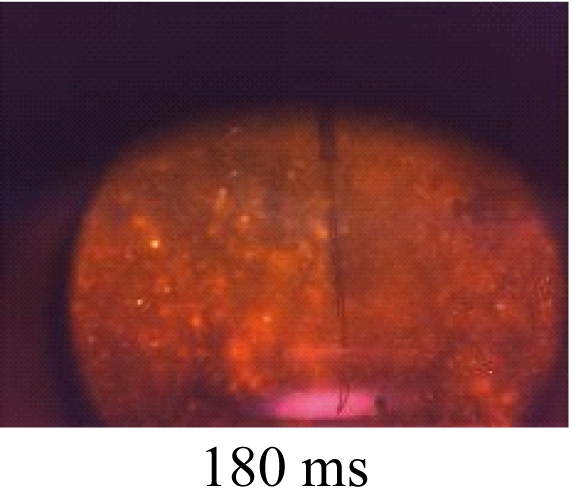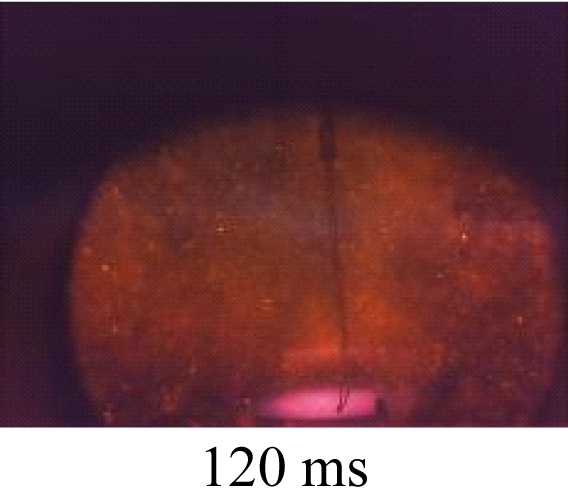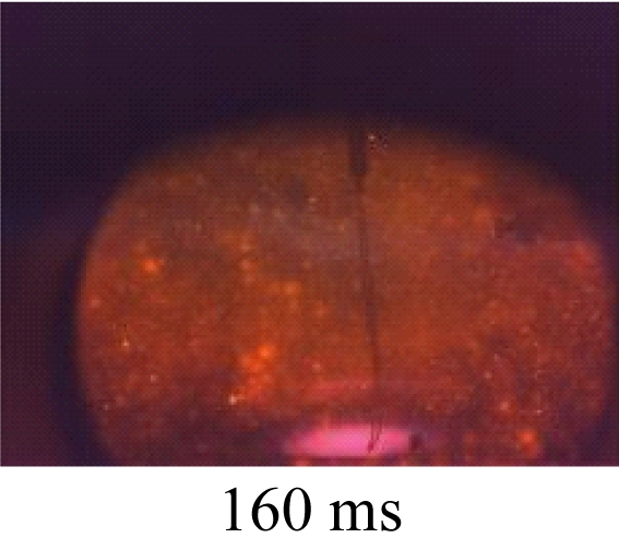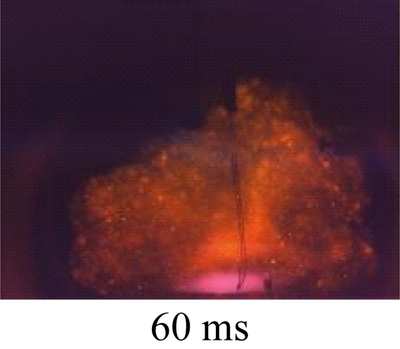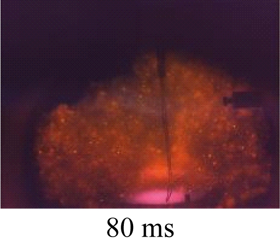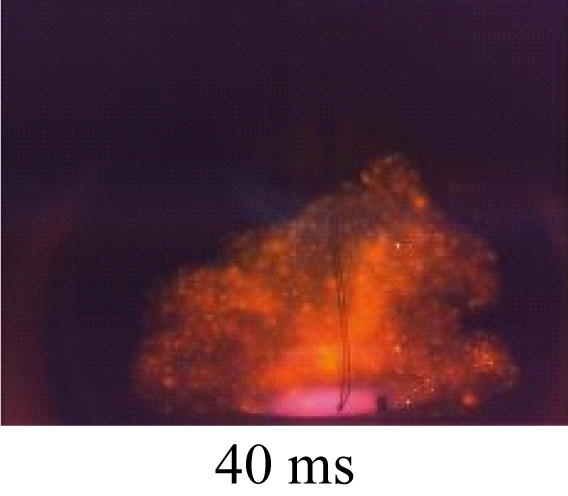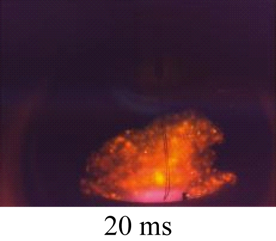 在高温热源表面点火方式下,甲烷/煤尘的Tgd只出现了1个峰值,其变化规律与未加入煤尘前一致。这是因为在高温热源表面诱发条件下,煤尘铺设在高温热源表面,其点火区域面积较电火花方式更大,导致爆炸时煤尘与瓦斯/空气燃烧充分,促使温度直接升高。到反应后期,煤尘已经随甲烷燃烧结束。该过程如图8所示(爆炸压力开始升高的时刻记做0 ms)。