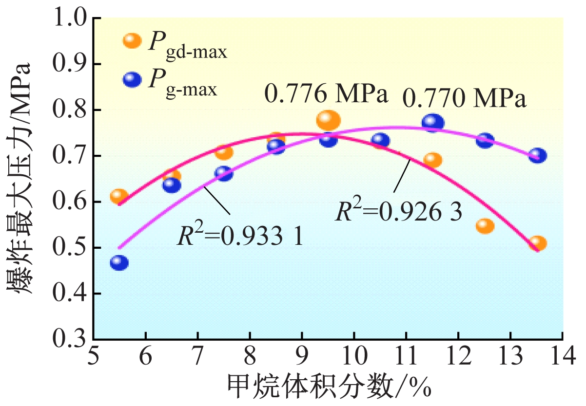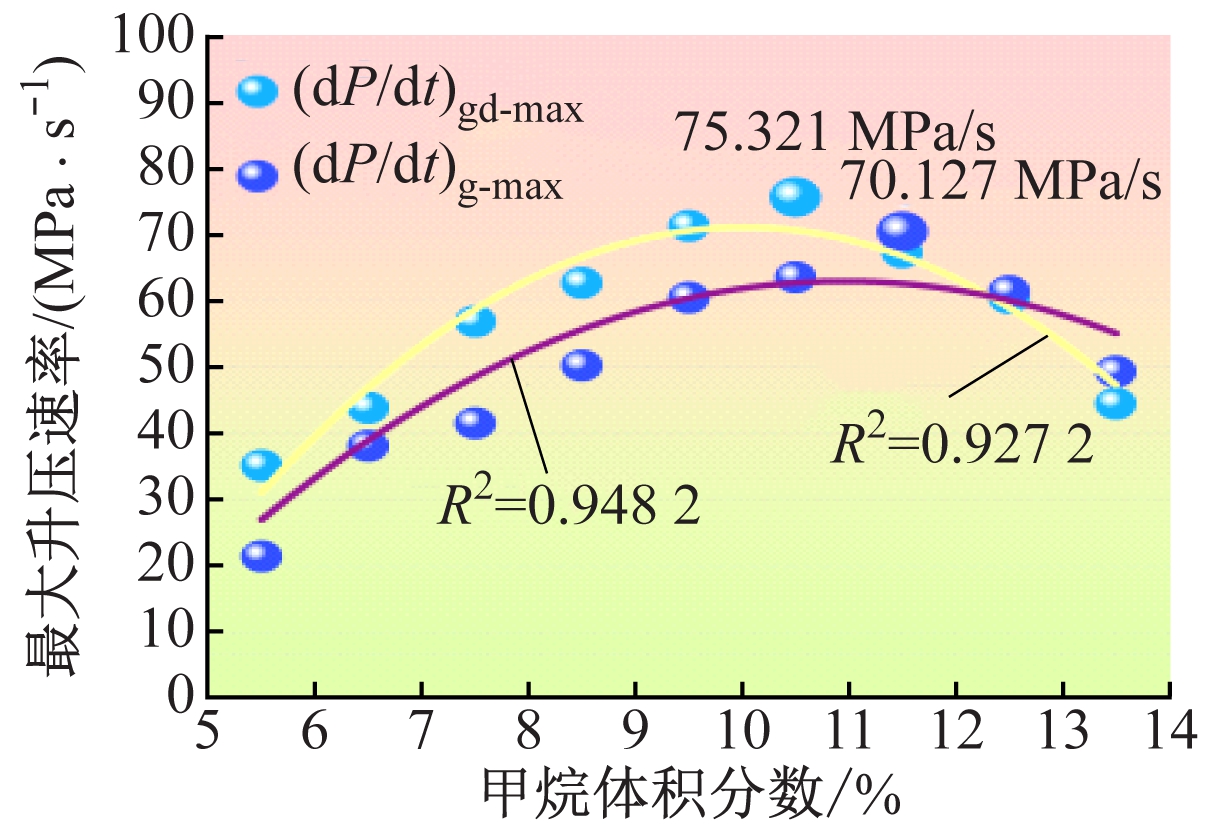 对各浓度下甲烷/煤尘的Pgd-max,(dP/dt)gd-max和Tgd-max进行拟合。由图6可知,拟合优度R2均较未加入煤尘时降低,说明由于煤尘的参与,Pgd-max,(dP/dt)gd-max和Tgd-max的规律性下降。