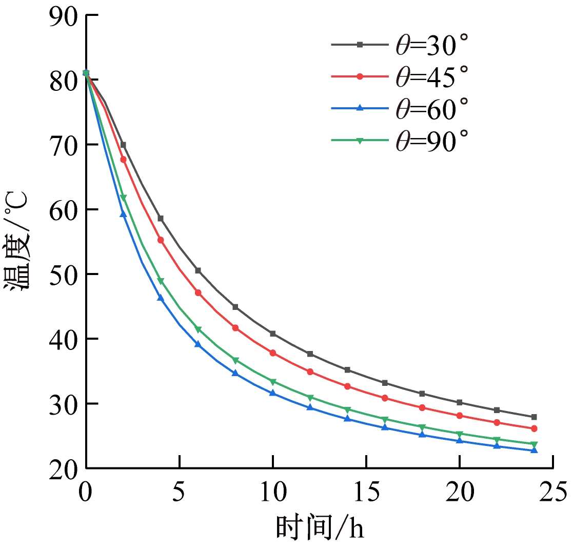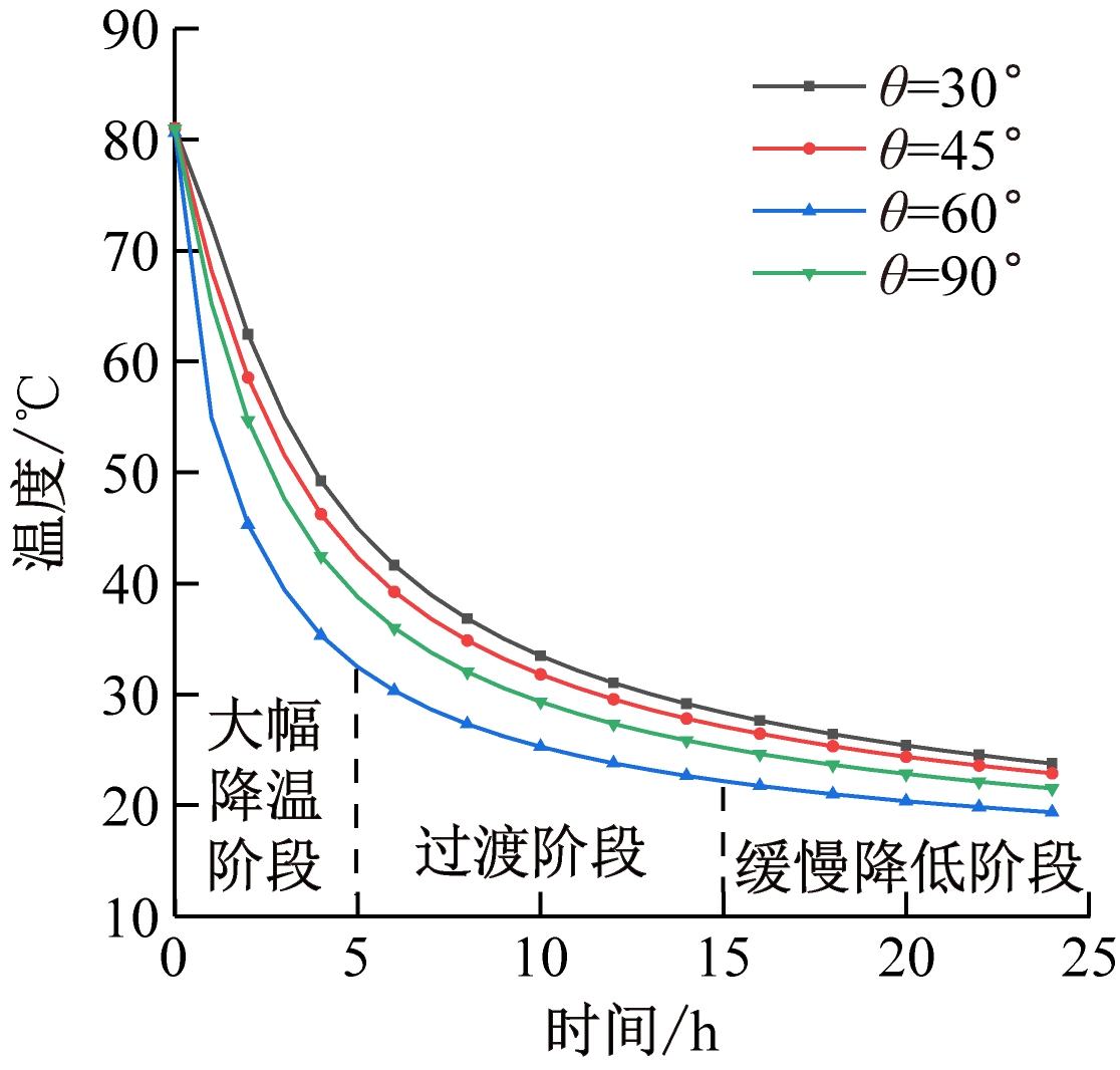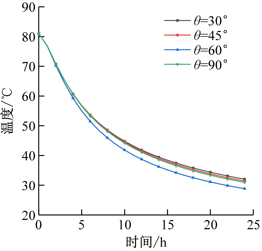 煤堆高温热源点加热至一定温度后,将热管插入煤堆中,插入深度H分别取40,50,60 cm,插入倾角θ分别取30,45,60,90°,煤堆内部高温热源点温度变化的模拟值如图3所示。由图3可看出,煤堆降温过程可分为3个阶段,即大幅降温阶段、过渡阶段和缓慢降低阶段。以热管插入深度60 cm为例,0~5 h为大幅降温阶段,该阶段煤堆温度较高,外界环境温度较低,由于空气对流换热和热管换热的影响,高温热源点温度急剧下降;5~15 h为过渡阶段,煤堆降温速率变慢,这是因为煤堆温度降低,与外界温差减小,且随着煤堆温度降低,热管的工作效率也随之降低,从而导致降温速度减缓;15~24 h为缓慢降低阶段,由于煤堆温度降低,与外界环境温度接近,煤堆温度趋于稳定状态。