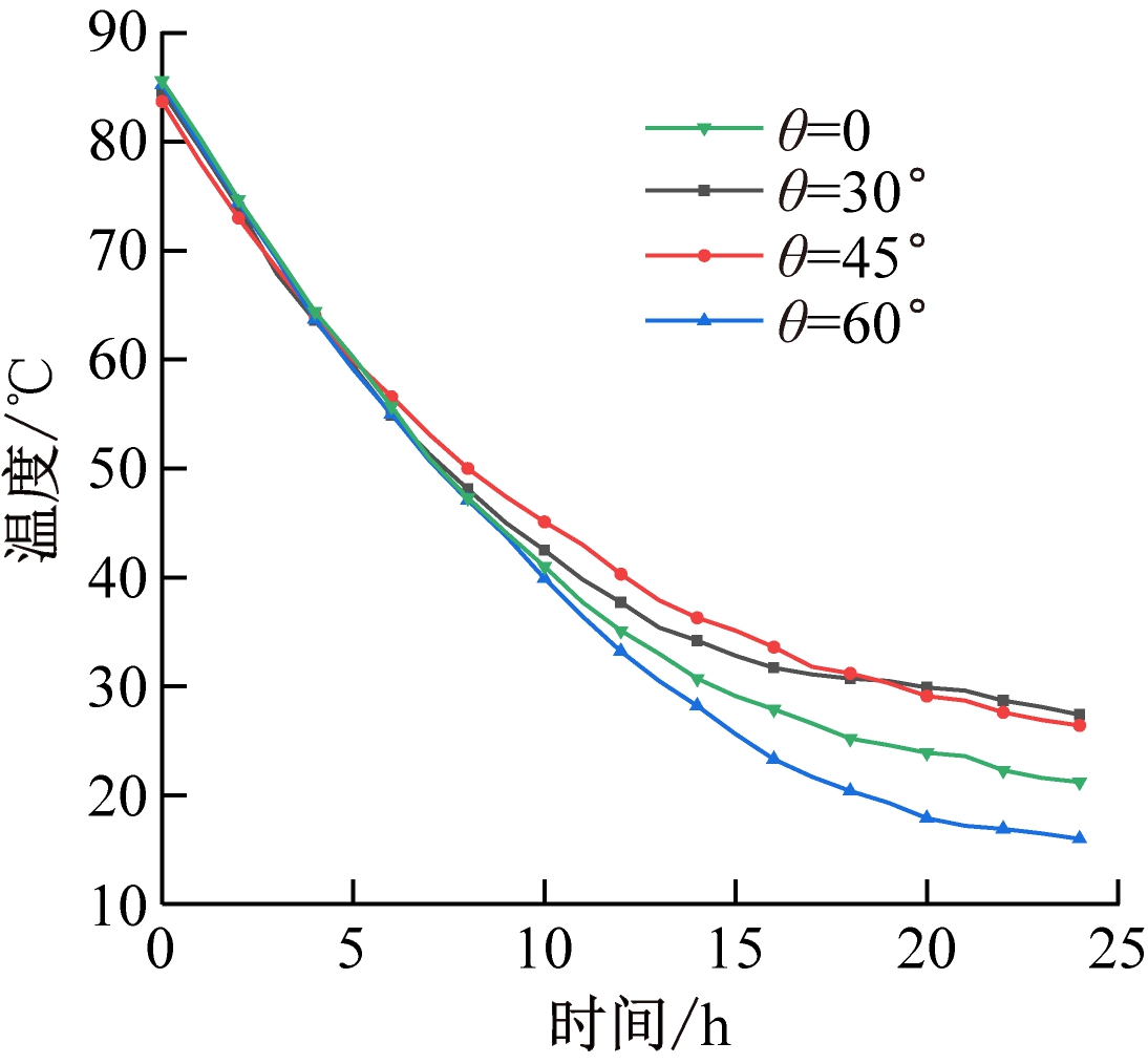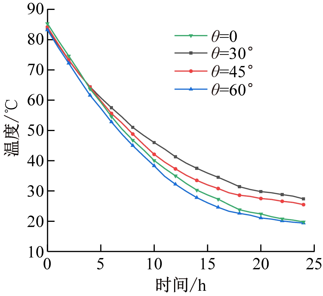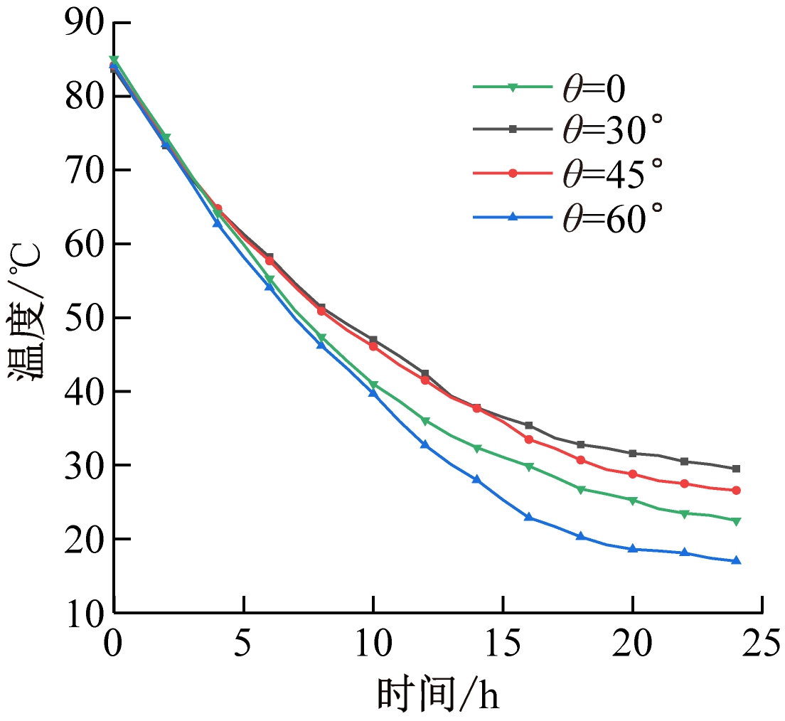 煤堆高温热源点加热至一定温度后,将热管插入煤堆中,插入深度H分别取40,50,60 cm,插入倾角θ分别取30,45,60,90°,煤堆内部高温热源点温度变化的模拟值如图3所示。由图3可看出,煤堆降温过程可分为3个阶段,即大幅降温阶段、过渡阶段和缓慢降低阶段。以热管插入深度60 cm为例,0~5 h为大幅降温阶段,该阶段煤堆温度较高,外界环境温度较低,由于空气对流换热和热管换热的影响,高温热源点温度急剧下降;5~15 h为过渡阶段,煤堆降温速率变慢,这是因为煤堆温度降低,与外界温差减小,且随着煤堆温度降低,热管的工作效率也随之降低,从而导致降温速度减缓;15~24 h为缓慢降低阶段,由于煤堆温度降低,与外界环境温度接近,煤堆温度趋于稳定状态。