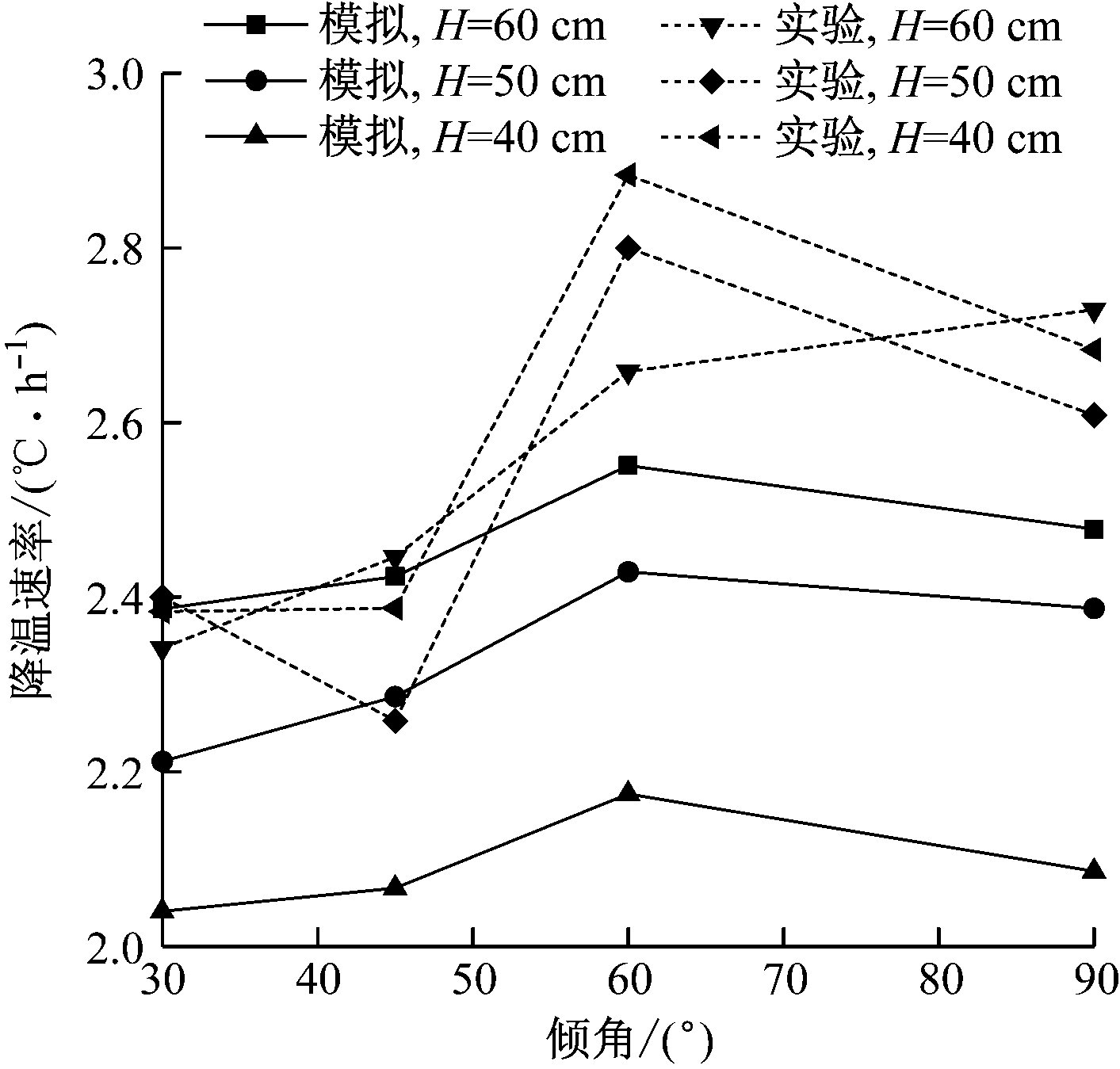 热管降温速率模拟结果与实验结果对比如图7所示。可以看出,虽然不同布置方式下的实验数值与模拟数值具有一定差异,但除热管插入深度为40 cm时之外,整体趋势相近。从实验结果可看出,随着倾角增加,热管降温速率先减小、后增加;热管插入倾角为60°时,降温速率达到最大值。在实验过程中,热管插入深度为40 cm、倾角为90°时,高温热源点降温速率高于插入深度为50 cm和60 cm时的降温速率。这是由于实验过程周期较长,外界温差较大,空气与煤堆的对流换热加强,从而导致降温幅度与趋势不符。另外,由于数值模拟忽略了煤堆的含水率、环境风速及空气湿度变化等因素影响,其结果与实验结果有一定误差。