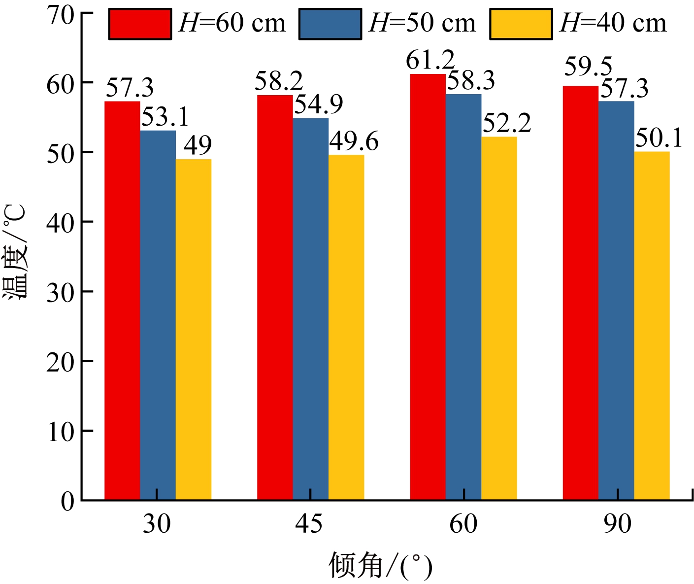 (2) 在相同倾角下,重力热管布置深度越大越好,即距离热源越近越好;在相同深度下,重力热管布置倾角为60,90,45,30°时,降温幅度依次递减。