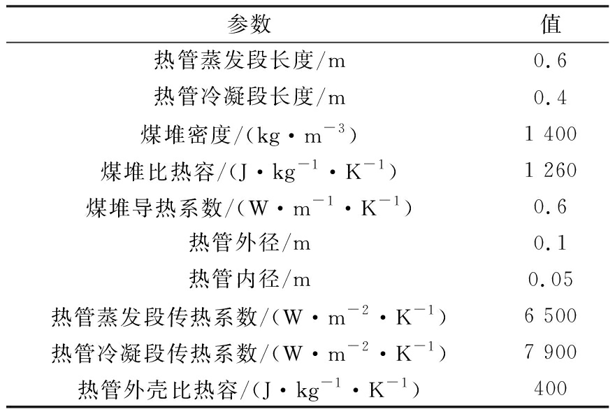 参数值热管蒸发段长度/m0.6热管冷凝段长度/m0.4煤堆密度/(kg·m-3)1 400煤堆比热容/(J·kg-1·K-1)1 260煤堆导热系数/(W·m-1·K-1)0.6热管外径/m0.1热管内径/m0.05热管蒸发段传热系数/(W·m-2·K-1)6 500热管冷凝段传热系数/(W·m-2·K-1)7 900热管外壳比热容/(J·kg-1·K-1)400