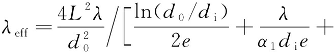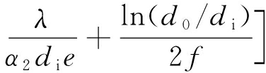 式中:L为热管的总长度,m;λ为热管外壳的热导率,W/(m·K);d0为热管外径,m;di为热管内径,m;e=L1/L,f=L2/L,L1,L2分别为蒸发段和冷凝段长度,m;α1,α2分别为蒸发段和冷凝段的传热系数,W/(m2·K)。