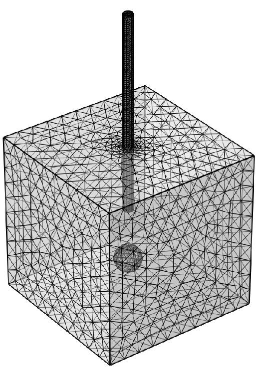 基于储煤堆移热实验台,采用Comsol软件建立煤堆、热管和热源的物理模型。设置煤堆模型为1.2 m×1.2 m×1.2 m的多孔介质立方体,热源模型为半径为0.1 m的球体,重力热管模型为具有冷源属性的金属棒,如图2(a)所示。采用软件内置的网格控件将煤堆模型划分为自由三角形网格,完整网格共包含44 720个域单元、5 100个边界单元和516个边单元,如图2(b)所示。