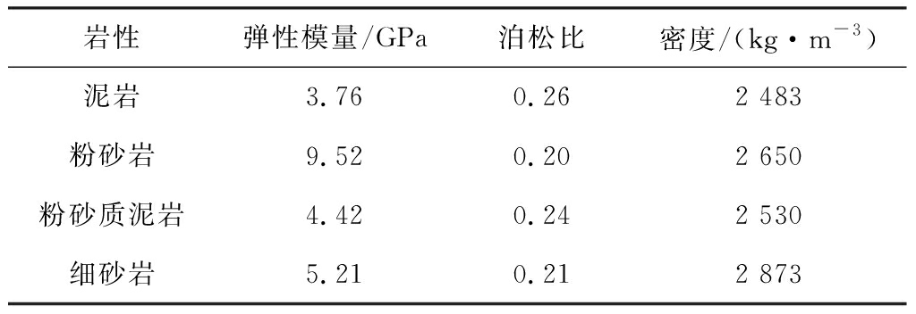 岩性弹性模量/GPa泊松比密度/(kg·m-3)泥岩3.760.262 483粉砂岩9.520.202 650粉砂质泥岩4.420.242 530细砂岩5.210.212 873